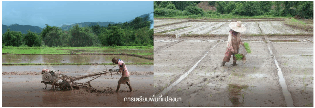 1. เตรียมพื้นที่แปลงนาอย่างประณีต ทำเทือกให้สม่ำเสมอ ลดน้ำในแปลงเพื่อให้ต้นข้าวยึดติดได้ง่าย