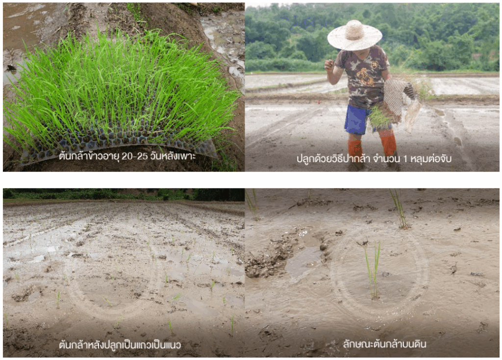 3. ต้นกล้าข้าวอายุ 20-25 วันหลังเพาะ นำไปปลูกด้วยวิธีการปากล้า ให้เป็นแถวเป็นแนว ระยะระหว่างแถว/หลุมประมาณ 25 x 25 เซนติเมตร
