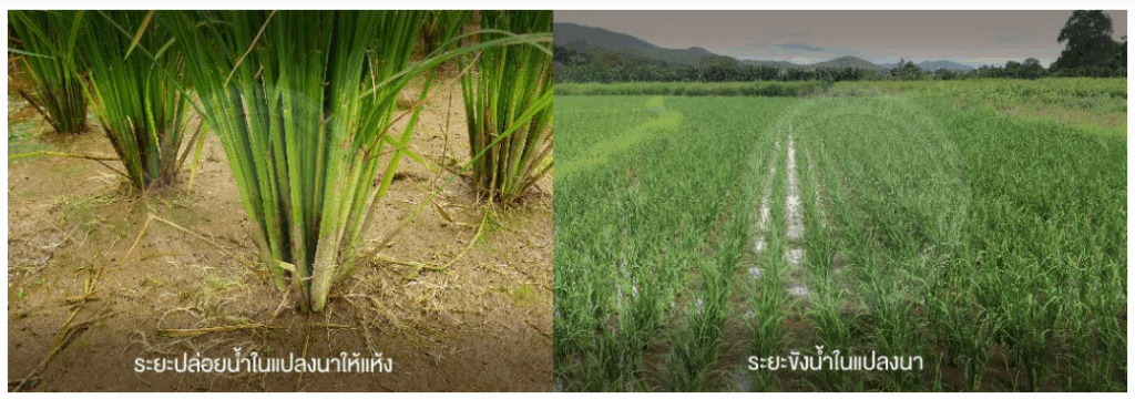 4. ดูแลรักษาแปลงข้าว ร่วมกับการให้น้ำในแปลงนาด้วยวิธีนาน้ำน้อย และกำจัดต้นพันธุ์ปนในระยะแตกกอ ระยะออกรวง และระยะก่อนเก็บเกี่ยว