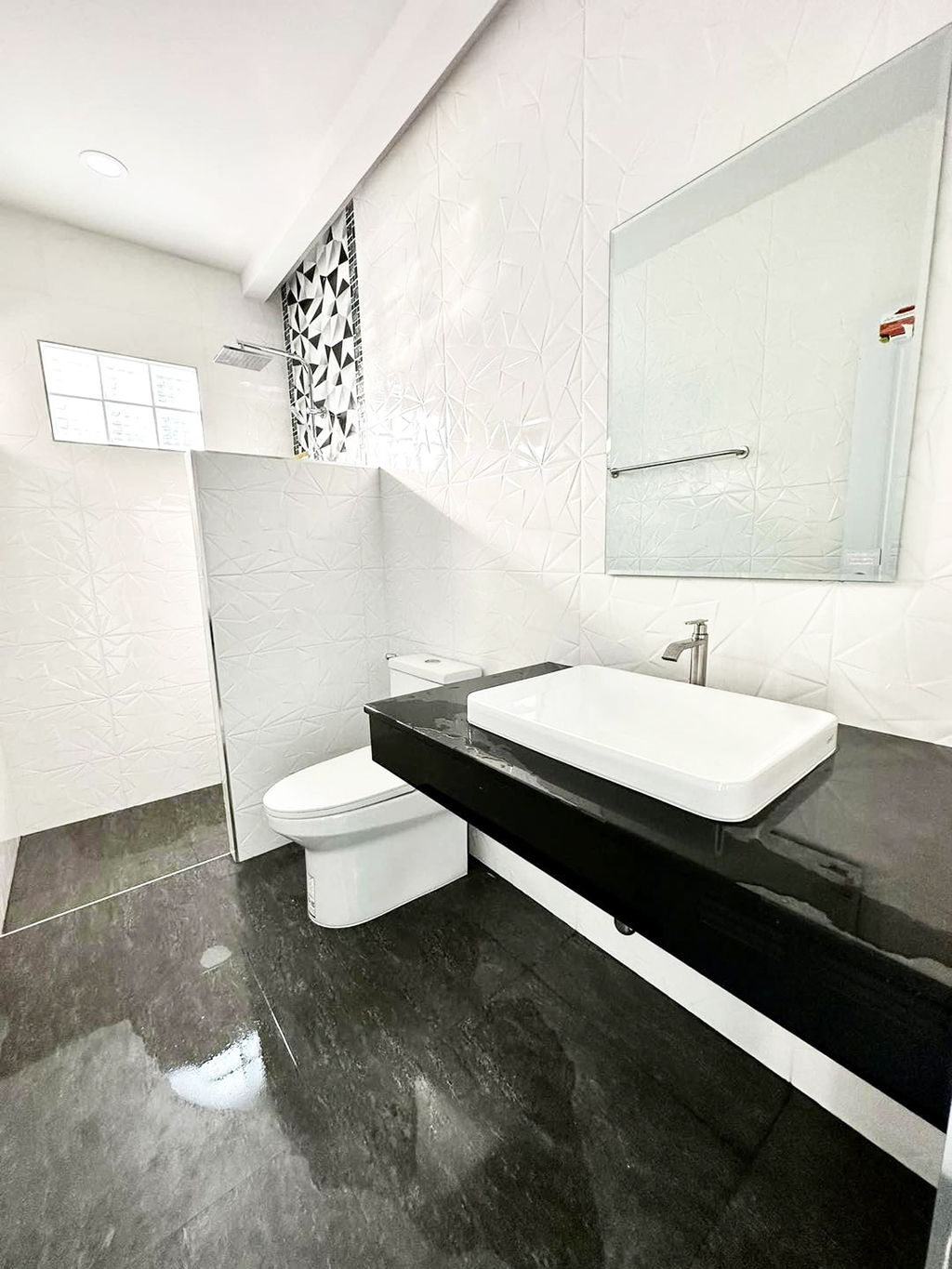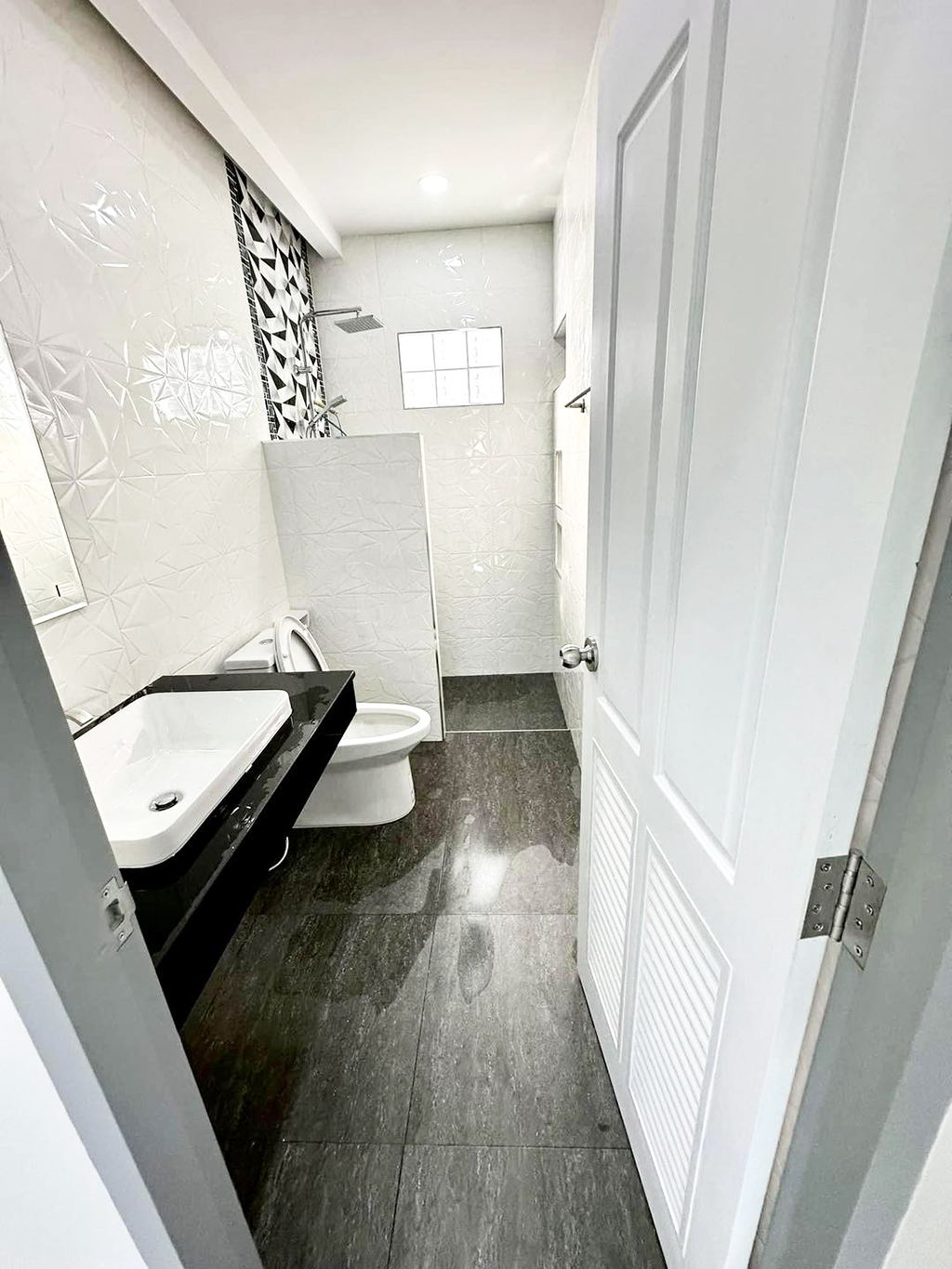 ห้องน้ำ กรุด้วยกระเบื้องทั้งห้องโดยใช้กระเบื้องสีเทาเป็นหลัก ก่อผนังกั้นส่วนอาบน้ำไว้ด้านในแบบเดียวกับอีกห้อง พร้อมทำพื้นต่างระดับช่วยระบายน้ำแบบเดียวกัน