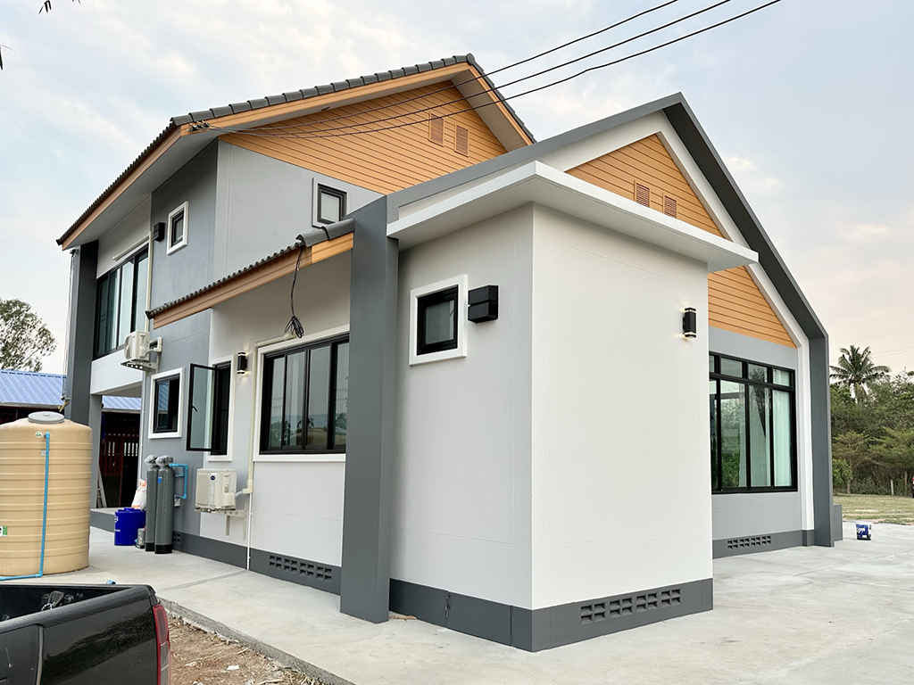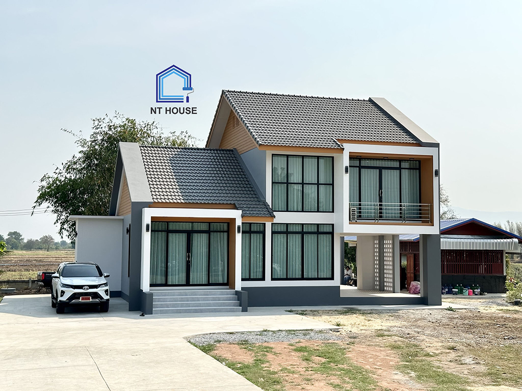 แบบบ้านสไตล์โมเดิลนอร์ดิก ทันสมัยพื้นที่ใช้สอยลงตัว บ้านพักอาศัยขนาดกลางที่มีงานดีไซน์ที่สวยงาม บ้านหลังนี้เป็นบ้านสองชั้น  ขนาด 3 ห้องนอน 3 ห้องน้ำ 1 ห้องโถง 1 ครัว 1 ซักล้าง ฐานของบ้านถูกยกขึ้นสูงเพื่อป้องกันปัญหาน้ำท่วมขัง พร้อมกับมีการปรับองค์ประกอบให้บ้านสามารถรับลมได้ดีจากหน้าต่างหลายบาน ซึ่งเป็นการปรับรูปแบบจากบ้านนอร์ดิกดั้งเดิม เพื่อให้เหมาะกับเมืองร้อน  ตัวบ้านเน้นโทนสีขาว ตัด ส้ม ที่ให้บรรยากาศอบอุ่นเย็นตา