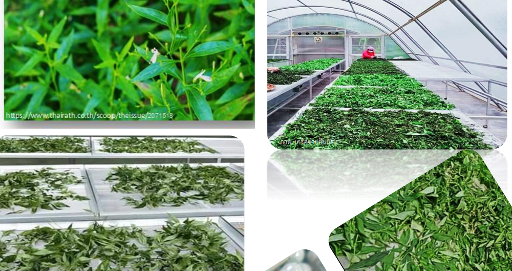 นำต้นฟ้าทะลายโจรหลังเก็บเกี่ยว ล้างในน้ำสะอาด ผึ่งลมให้สะเด็ดน้ำ ตัดหรือน ให้มีความยาว 3-5 ชม. แล้วนำมาเกลี่ยบนกระดัง คลุมด้วยผ้าขาวบาง นำไปตากให้แห้งหรือใส่ถาดสเตนเลส เข้าตู้อบอุณหภูมิ 55 องศา นาน 48 ชม. จนฟ้าทะลายโจรแห้ง มีความชื้นไม่เกิน 11% เก็บใส่ถุงพลาสติกใสผนึกให้แน่น เก็บในที่สะอาด
