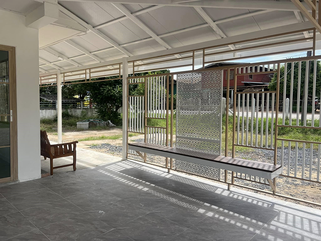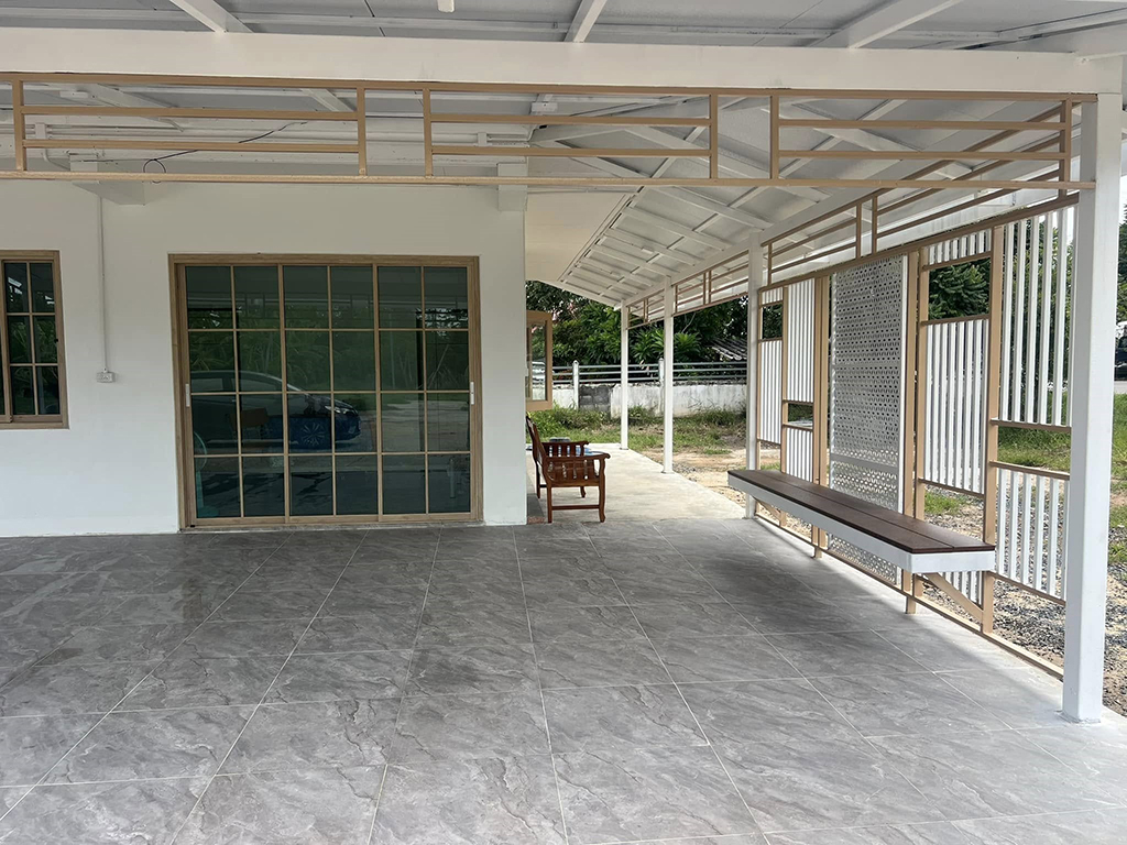 - ต่อเติมหลังคาทางเดินรอบบ้าน และหลังคากันสาดพื้นที่นั่งพักผ่อน