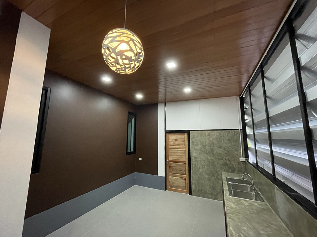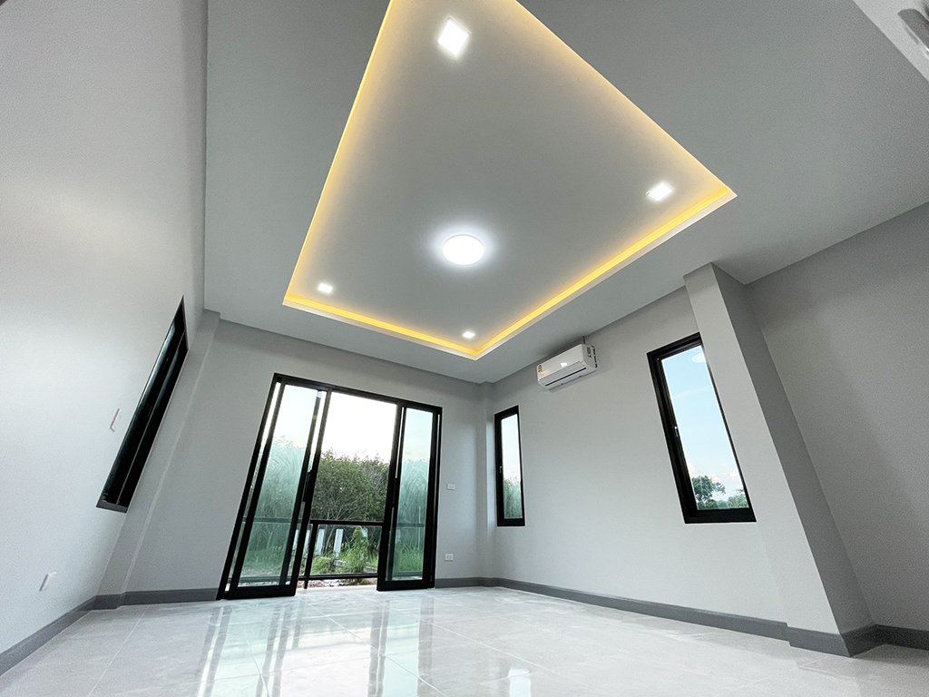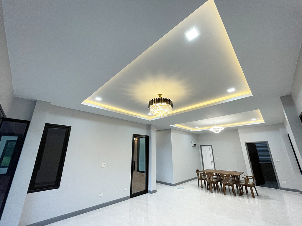 ภายในบ้านจัดสรรพืนที่ใช้สอยได้สวยงาม มาพร้อมกับโซฟารับประทานอาหาร ผนังห้องสีขาว ฝ้าเพดานแบบฝ้าหลุม ตกแต่งด้วยหลอดไฟ LED สีทอง และโคมไฟแบบแชนเดอเลียดวงกลมโตสวยงาม ปูพื้นด้วยกระเบื้องสีขาว