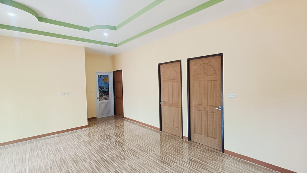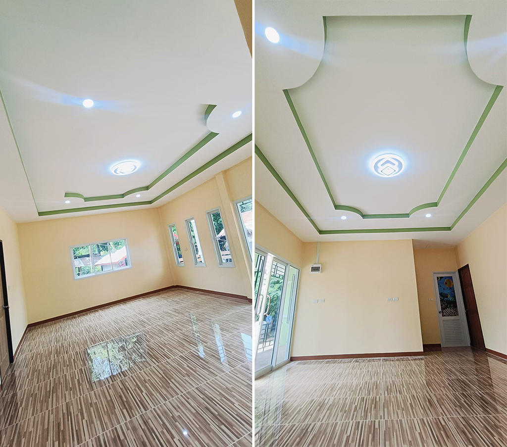 ส่วนฝ้าเพดานแบบหลุมตกแต่งด้วยลายโค้งสีเขียว ดูสวยแปลกตาและช่วยเพิ่มมิติให้กับห้อง โคมไฟตรงกลางฝ้าเป็นแบบลวดลายทันสมัย พร้อมไฟดาวน์ไลท์รอบฝ้า ทำให้บรรยากาศยามค่ำคืนดูสว่างกำลังดี