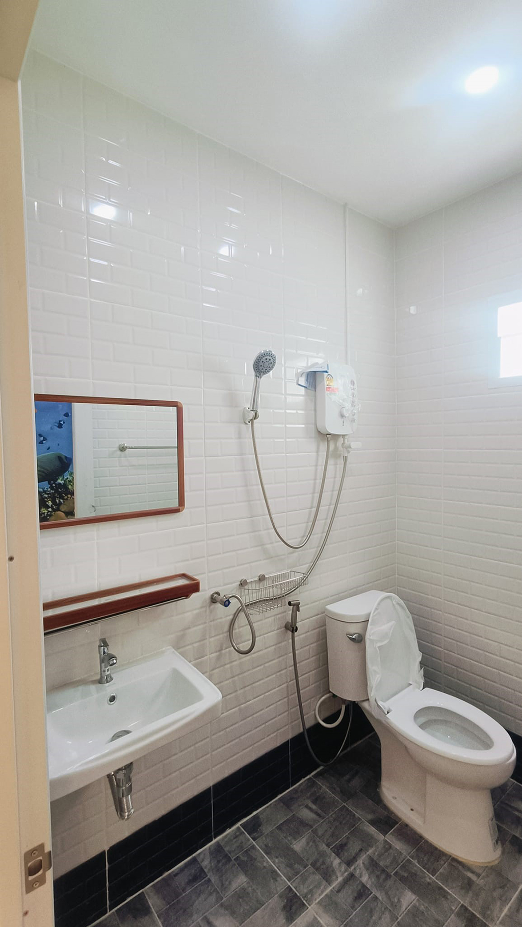 ห้องน้ำในบ้านหลังนี้ออกแบบอย่างเรียบง่ายแต่ใช้งานได้สะดวก ผนังปูด้วยกระเบื้องสีขาวลายอิฐ ช่วยให้ดูสะอาดตาและสว่างขึ้น พื้นใช้กระเบื้องลายหินโทนเทา ดูทันสมัยและไม่ลื่นง่าย ภายในติดตั้งสุขภัณฑ์ครบ ทั้งโถสุขภัณฑ์ อ่างล้างหน้า และเครื่องทำน้ำอุ่น พร้อมฝักบัวและที่วางของติดผนัง มีหน้าต่างบานเล็กช่วยระบายอากาศให้ห้องน้ำไม่อับชื้น